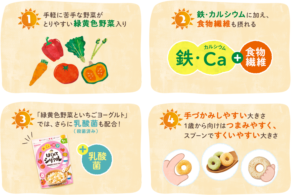 4種類の緑黄色野菜といちご、ヨーグルト、國(guó)産米をパフにした甘さひかえめのシリアルです。野菜やいちごヨーグルトのやさしい風味です。
