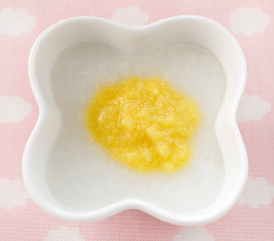 5~6 か月頃まではなめらかなペースト状になるように、ゆでてからすりつぶしましょう。