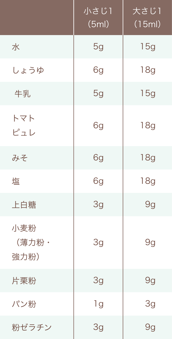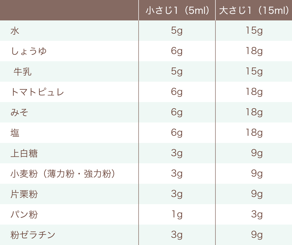 同じ「大さじ1」でも、水は15g、しょうゆは18gというように、調味料によって重量は異なるので、参考にしてください。計量スプーンの分(fēn)量は「容量(ml)」で「重量(g)」ではありません。